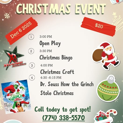 Join us on December 6th for our Christmas Event! For just $20, enjoy an afternoon of festive fun featuring open play, Christmas bingo, crafts, and a showing of Dr. Seuss’ How the Grinch Stole Christmas. A joyful way to celebrate the season with friends and family!